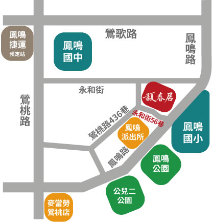 與鳳鳴國小、國中雙校園為鄰,閉上眼,讓校園悠揚鐘聲將心情更沉穩。